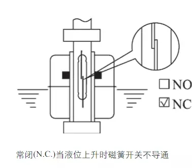 利用浮球內(nèi)的磁鐵去吸引磁簧開關(guān)的接點(diǎn),產(chǎn)生開與關(guān)的動(dòng)作,作液位的控制或指示。下圖為常閉(NC)及常開(NO)時(shí)浮球開關(guān)的相關(guān)位置