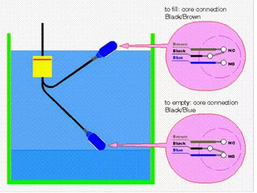 使用棕色和藍(lán)色的電線:浮球在上液位時,接點是接通的狀態(tài)。浮球在下液位時,接點是不通的狀態(tài)。